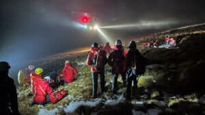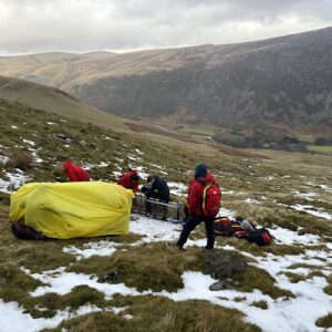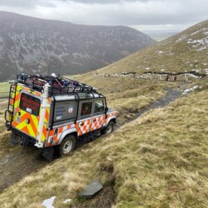 An unfortunate slip on wet grass resulted in an ankle injury. Unable to weight bear the casualty’s husband requested assistance. A convenient track up to Bowscale Tarn allowed Land Rover access close to the injured woman saving a long stretcher carry. After providing analgesia and splinting the ankle, the casualty was packaged for a short sledge back to the team vehicle, and a ride down to the road. They then made their own way to hospital for further checks and treatment.