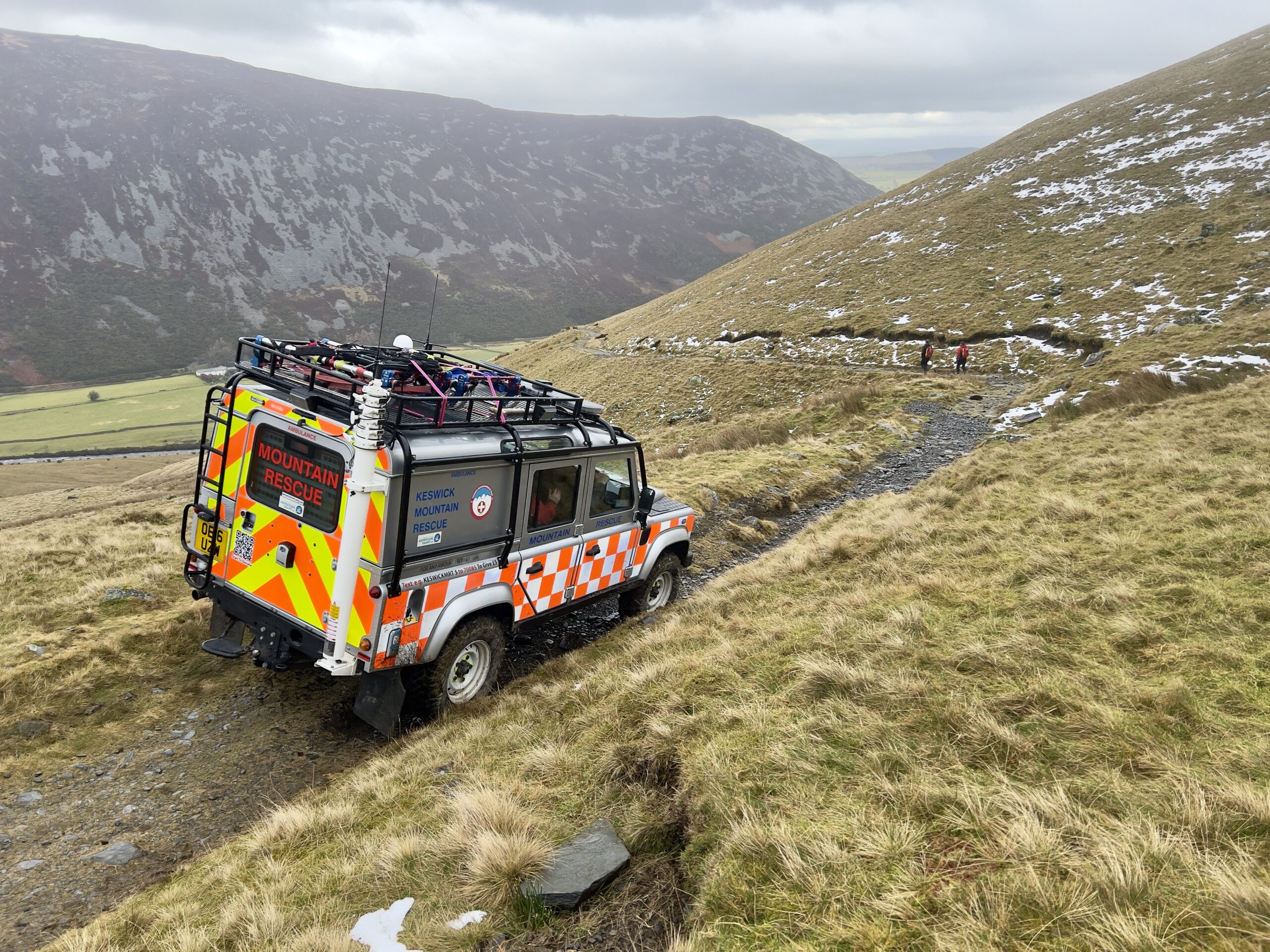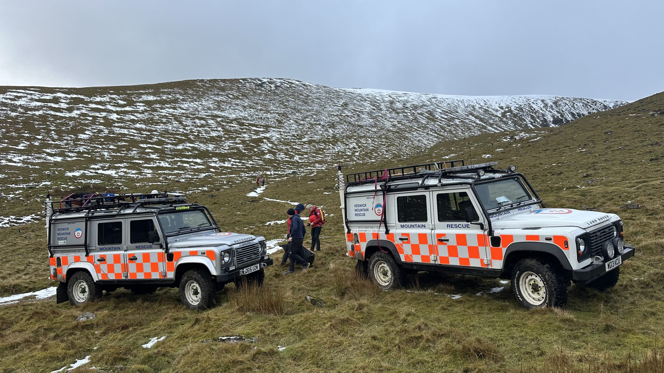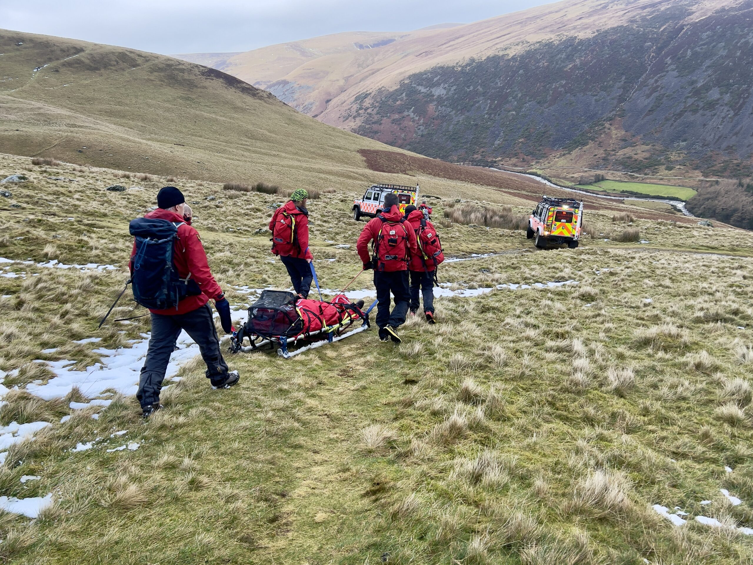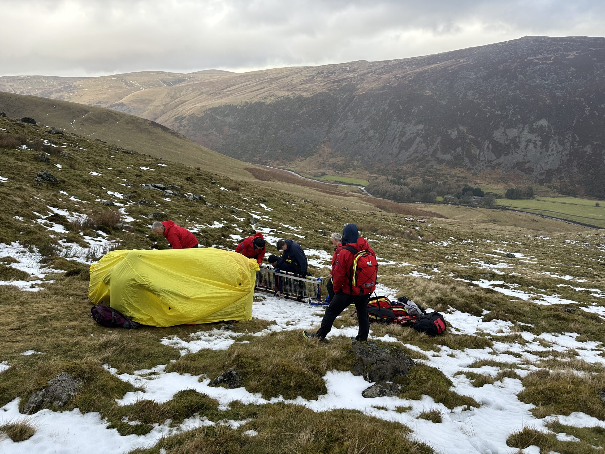 An unfortunate slip on wet grass resulted in an ankle injury. Unable to weight bear the casualty’s husband requested assistance. A convenient track up to Bowscale Tarn allowed Land Rover access close to the injured woman saving a long stretcher carry. After providing analgesia and splinting the ankle, the casualty was packaged for a short sledge back to the team vehicle, and a ride down to the road. They then made their own way to hospital for further checks and treatment.