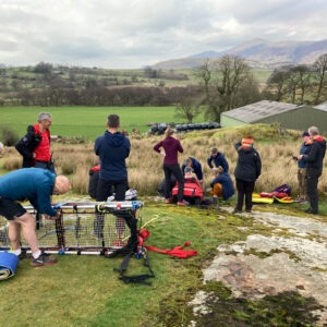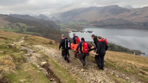 A couple in their 70s had taken the bus from Keswick to Thirlmere and were walking back to catch the bus at Dalebottom on the last day of their walking holiday. Despite having done the walk numerous times the man had an unfortunate slip on a rocky patch of the pathway resulting in a broken ankle. The stoic casualty declined pain relief whilst his ankle was splinted, he was then stretchered the short distance to a team vehicle. The man was then taken back to the rescue base to await an ambulance for onward transfer to hospital.