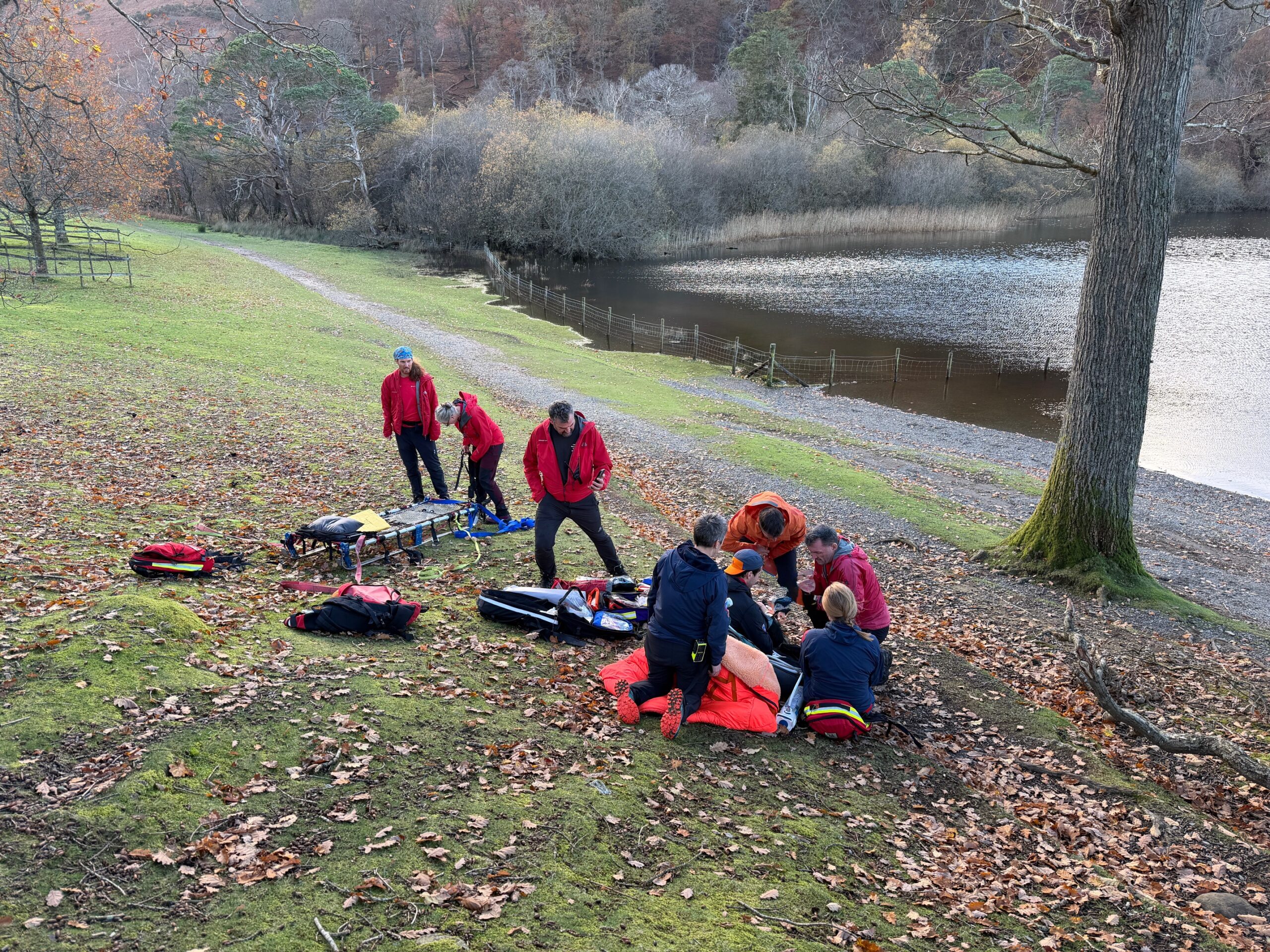 Out with family and friends on a Saturday hike our casualty “slipped on an acorn” on the lakeside path. The fall resulted in a significant leg injury with many team members in disbelief at the stoic resolve of the casualty. The team attended and reduced the fracture before splinting and evacuating the casualty from the lakeside for onward transport to hospital.