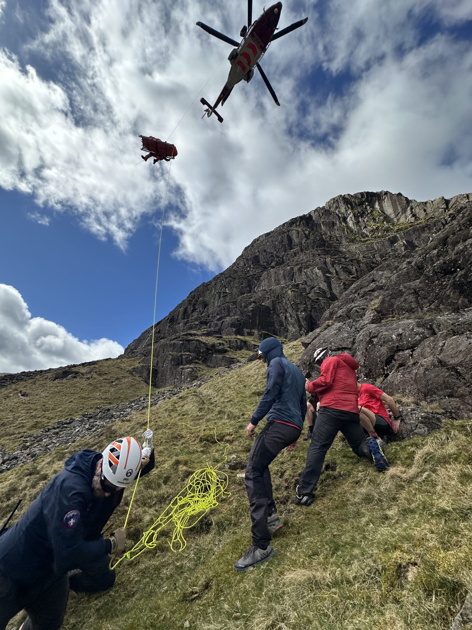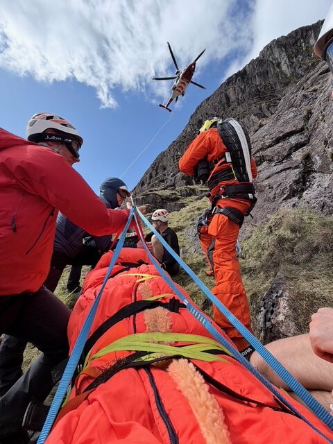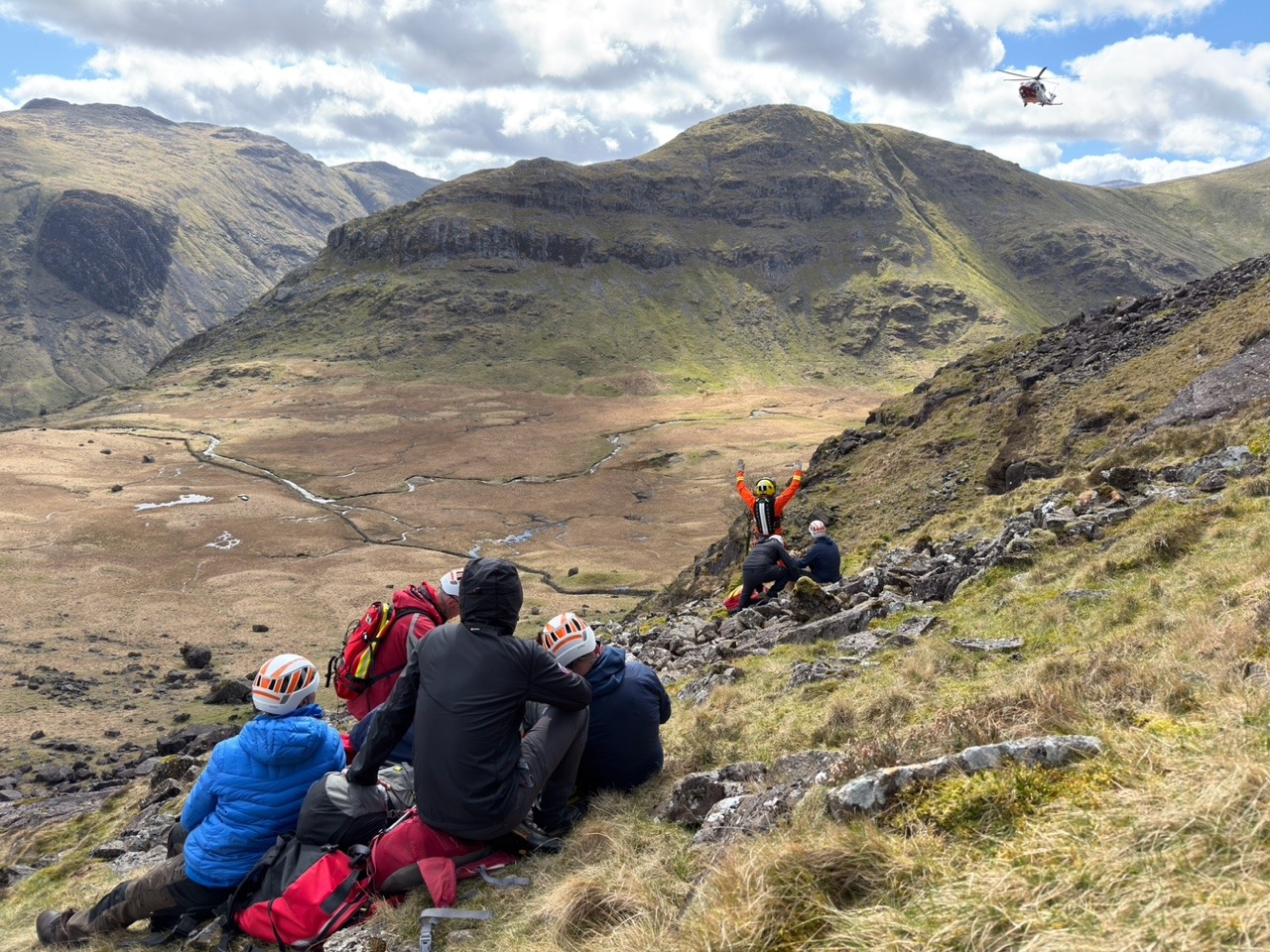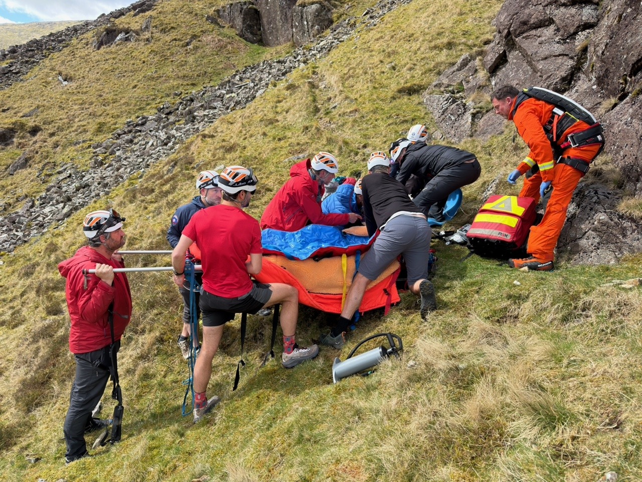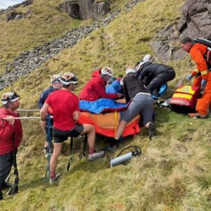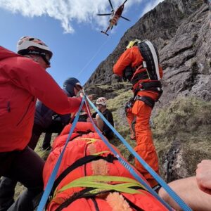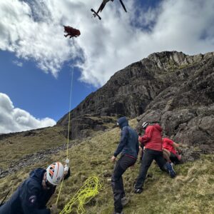 A report was received of a 60 year old woman who suffered a 50m tumbling fall, after slipping on steep broken ground whilst scrambling up the side of Raven Crag in Gillercombe. The fall caused severe cuts to her head. Due to the location and potential serious nature of the incident, assistance from Rescue 895, based at Carlisle, was requested. The woman was treated by the helicopter paramedic and Keswick team, before being packaged and winched to the helicopter for an airlift to hospital.