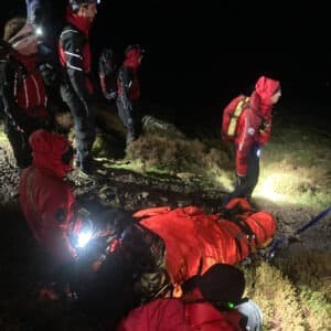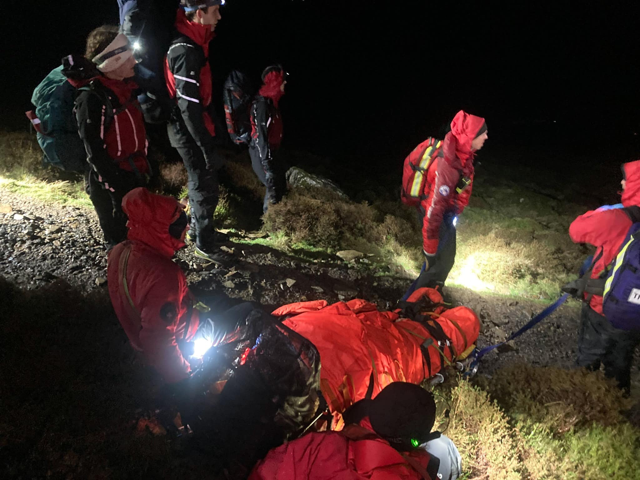 A couple located by Carlside Tarn below Skiddaw called 999 and asked for assistance after the woman injured her ankle and could not weight bear. Poor mobile signal and bad weather meant that attempts to get more information failed. Meantime the couple made valiant efforts and somehow made it along to the top of Ullock Pike where they managed to get through to the police once again. The team, very gratefully assisted by members of RAF Leeming Mountain Rescue Team, made their way up the ridge of Ullock Pike in wet and very wild conditions to the casualty location. Once protected from the elements in a group shelter, the woman was given strong analgesia before her ankle was reduced (realigned) and splinted. The team and RAF members were then able to mostly sledge the casualty on the stretcher back down to the roadside. As ever many thanks to RAF Leeming MRT for their help.