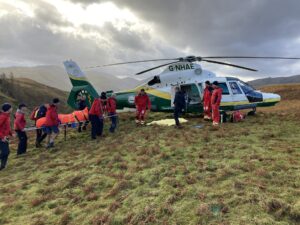 A 13 year old mountain biker took a tumble whilst flying over a jump on the south red trail in Whinlatter Forest. In what is becoming known as ‘the usual place’ and even with the presence of danger warning signs the young man parted company with his bike and landed face first in the dirt. Thanks to the passers by who went to his assistance until the team arrived. Team members including a team medic examined and treated the unlucky casualty at the scene before transporting him to the car park from where he was taken to hospital by his parents for a thorough check up.